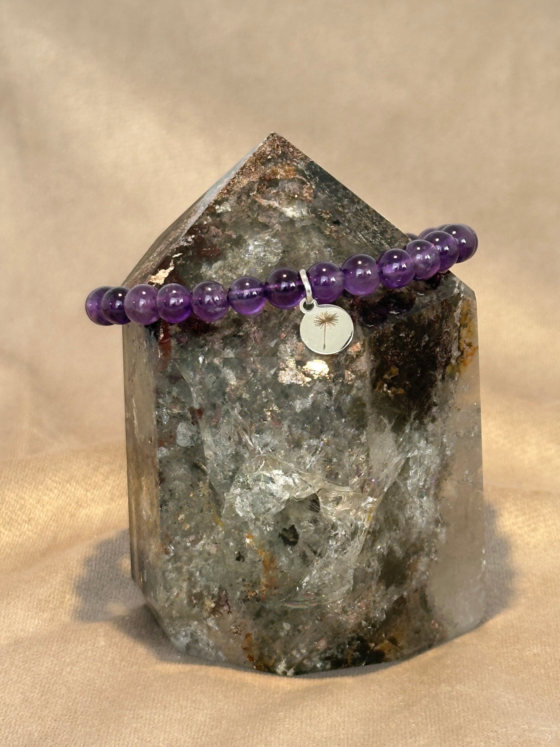 Het armbandje is gemaakt met een stevig elastiek en 6 mm-kralen van Amethist. Aan de armband hangt een RVS-bedel en de knoop is afgewerkt met een RVS-kraal. De bedel is gegraveerd met een pluisje, symbool voor troost, veerkracht en zachtheid.