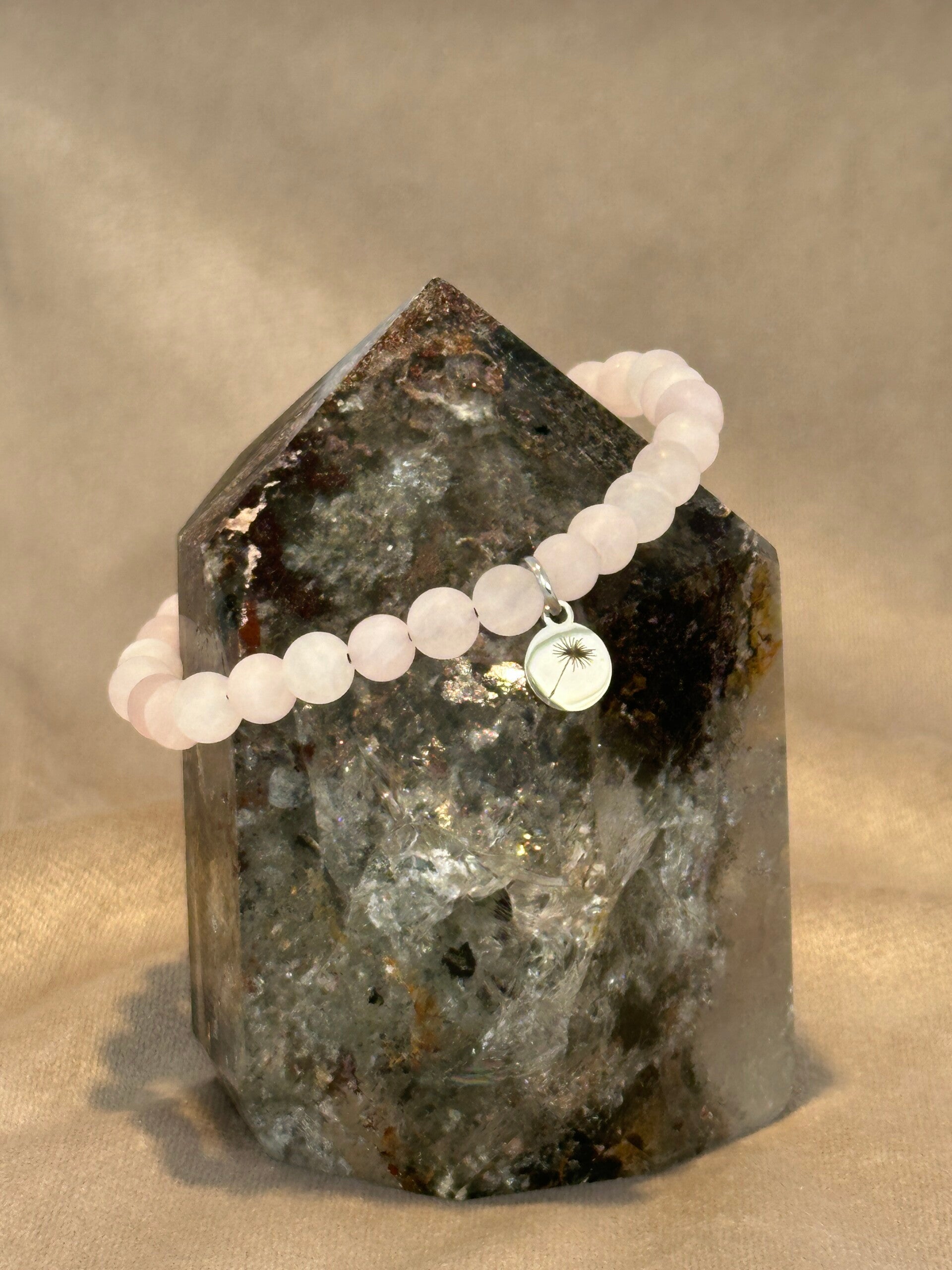 Het armbandje is gemaakt met een stevig elastiek en 6 mm-kralen van Rozenkwarts. Aan de armband hangt een RVS-bedel en de knoop is afgewerkt met een RVS-kraal. De bedel is gegraveerd met een pluisje, symbool voor troost, veerkracht en zachtheid.
