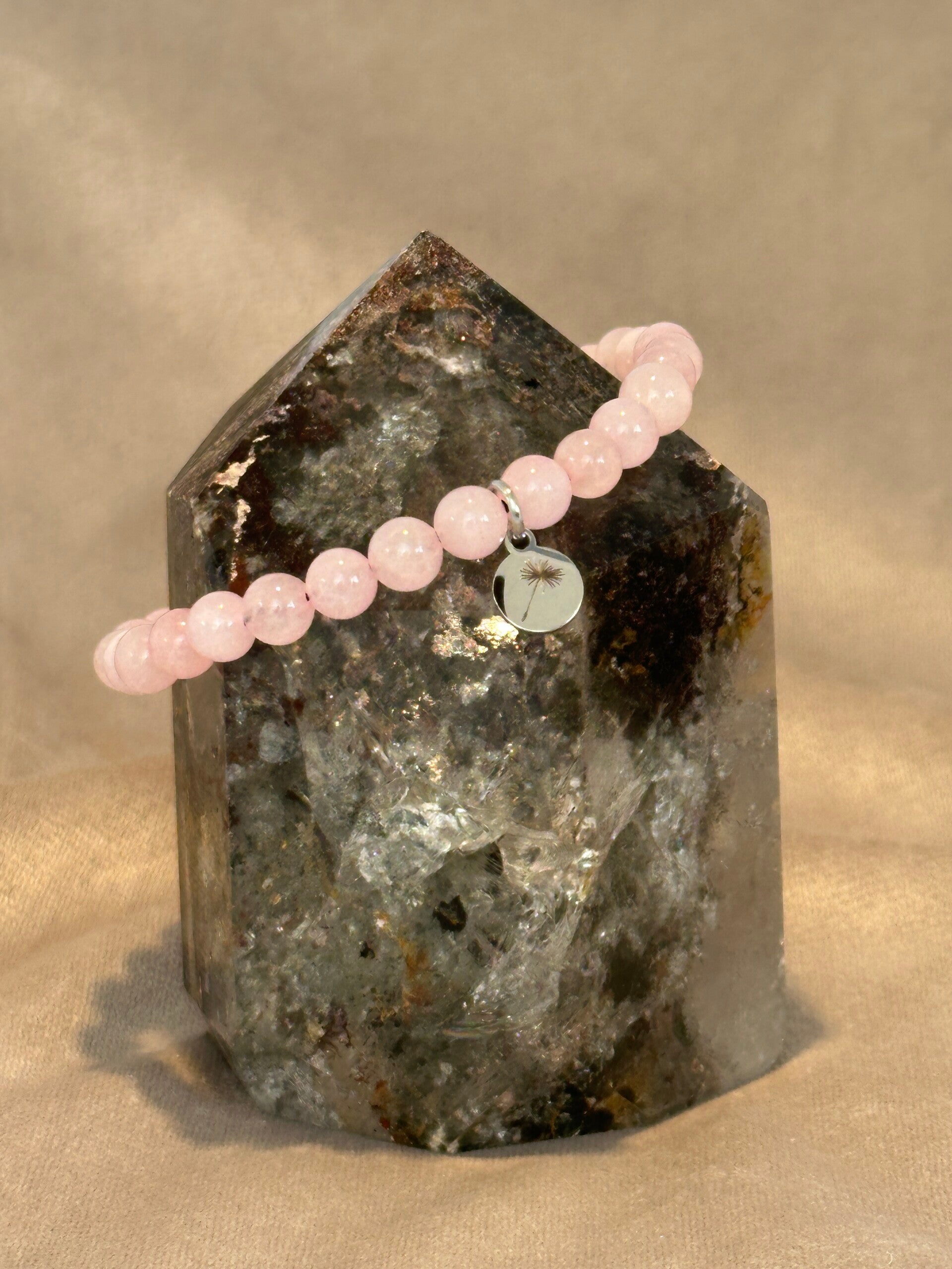 Het armbandje is gemaakt met een stevig elastiek en 6 mm-kralen van Rozenkwarts. Aan de armband hangt een RVS-bedel en de knoop is afgewerkt met een RVS-kraal. De bedel is gegraveerd met een pluisje, symbool voor troost, veerkracht en zachtheid.