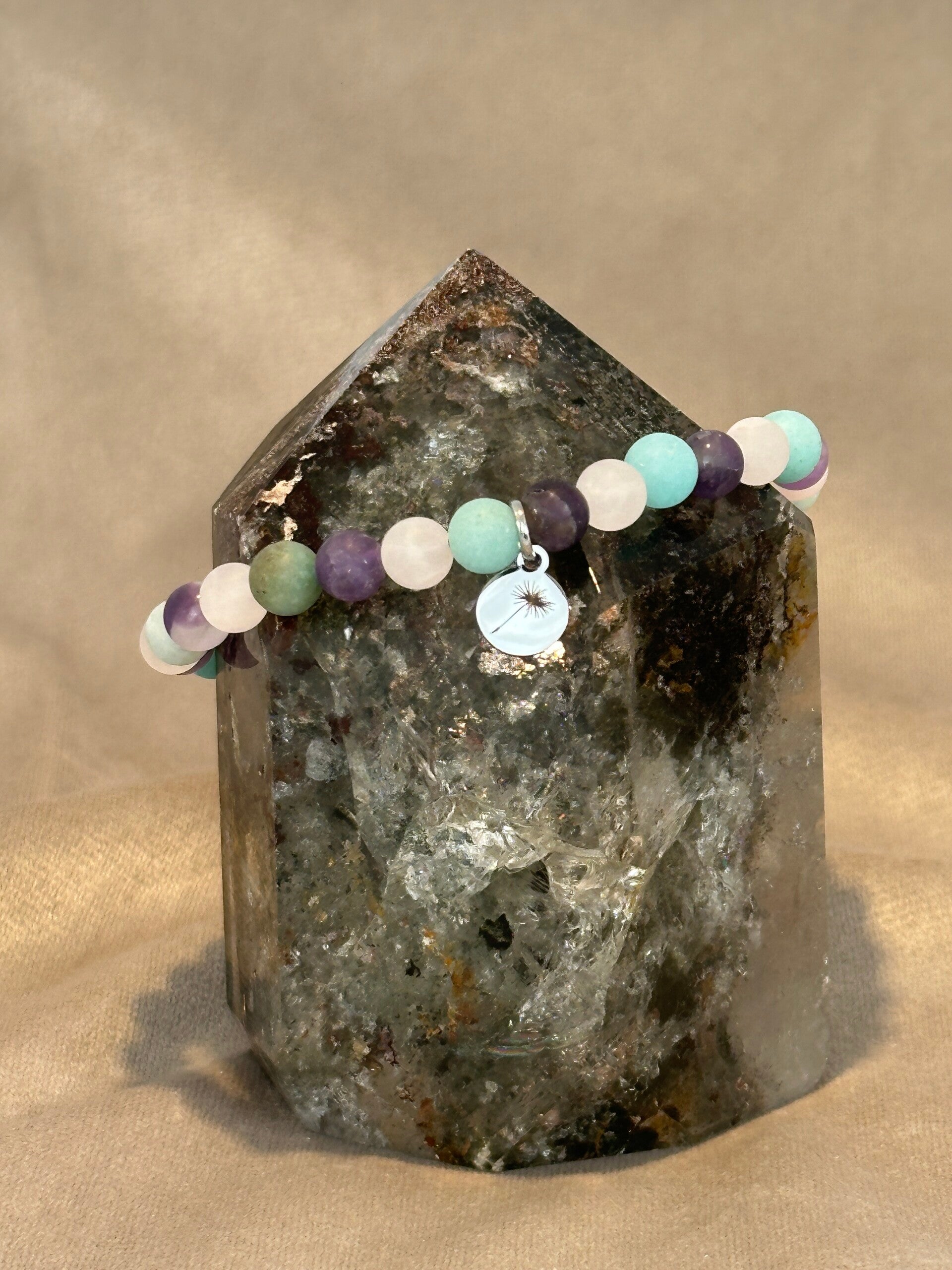 Het armbandje is gemaakt met een stevig elastiek en 6 mm-kralen van Rozenkwarts, Amethist en Amazoniet. Aan de armband hangt een RVS-bedel en de knoop is afgewerkt met een RVS-kraal. De bedel is gegraveerd met een pluisje, symbool voor troost, veerkracht en zachtheid.