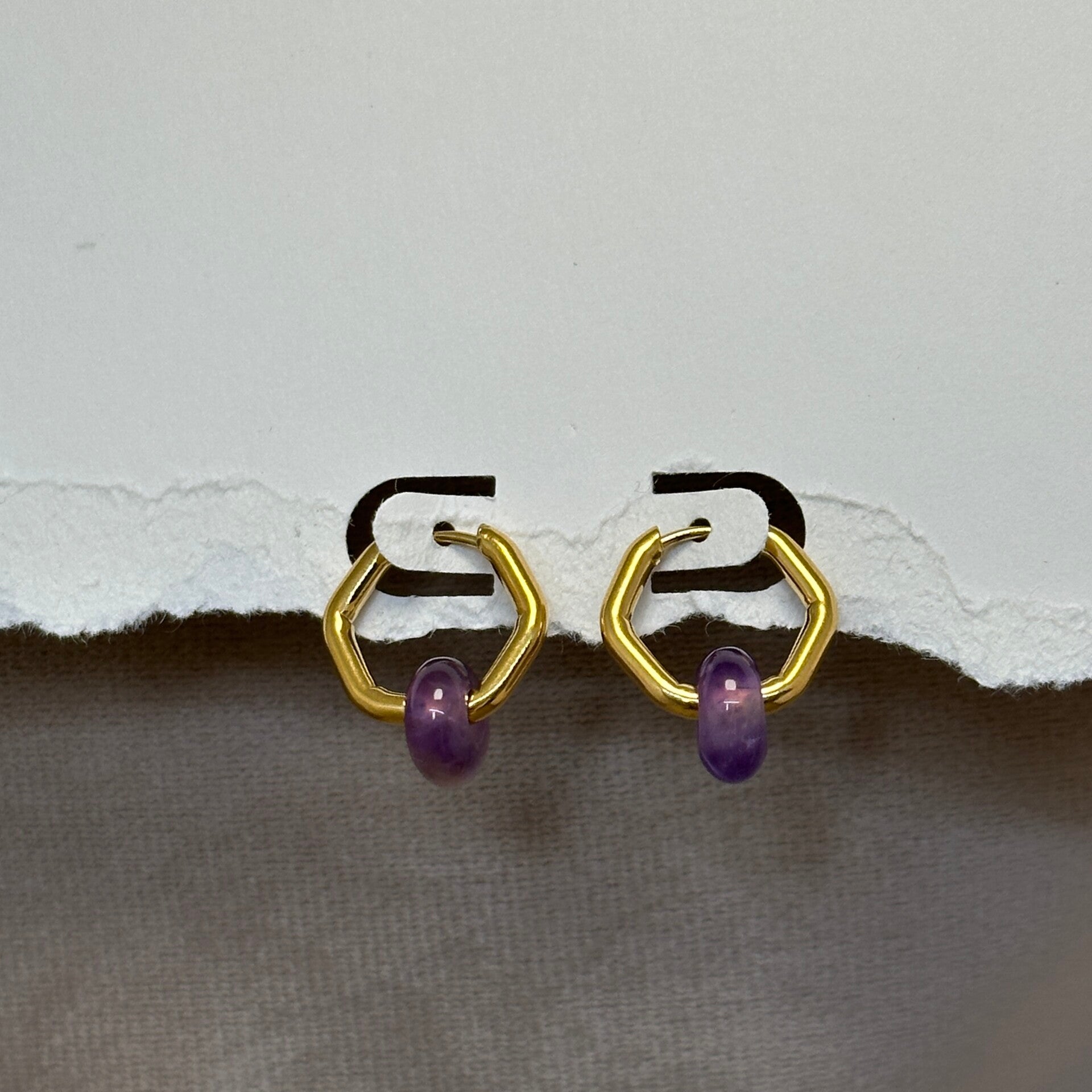 RVS (Goud) zeshoek Oorbellen met Amethist